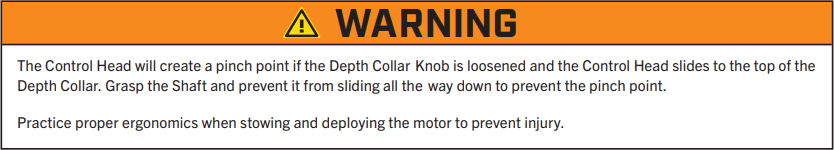 The Depth Collar is located on the Shaft above the Steering Housing. It functions to hold the motor at the proper depth while deployed. It also functions to hold the Lower Unit in place when stowed while not in use and during transport. The Depth Collar Knob is used to loosen and tighten the Depth Collar so that it can slide up and down the motor shaft. -