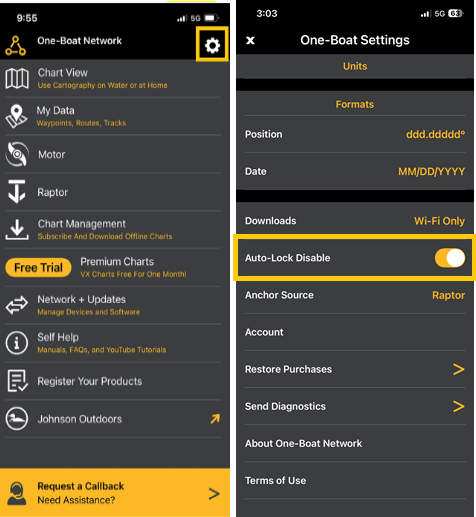 Note: The mobile device must remain powered on, and the One‑Boat App must stay open to prevent interruptions during the software update. You can enable the Auto-Lock Disable setting under setting on the One-Boat Network App.