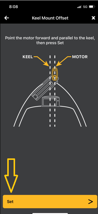 - If the placement of the trolling motor is pointing forward and parallel to the keel, tap Set.