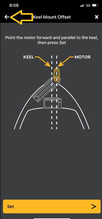 - Review all safety warnings. Follow the prompts in the One-Boat Network app. If the placement of the trolling motor is pointing forward and parallel to the keel, tap Set. The degree of Heading Sensor Offset shows at the bottom of the app Display.