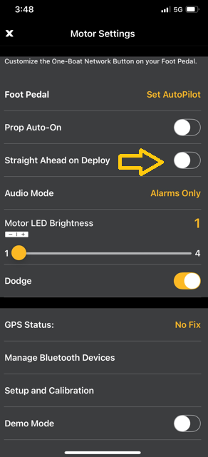 - In the Motor Setting Menu select radio button to select Straight Ahead on Deploy On or Off