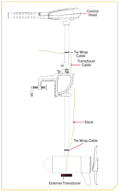 - Use two Tie Wrap Cables to secure the transducer cable to the Shaft just above the Lower Unit and just below the Control Head.