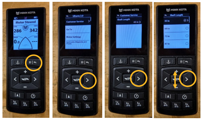 This may show up as a 45" motor continuing to trim past 45", or a 72", 87", or 100" motor stopping at 60". The steps below explain how to correct the shaft length setting so the motor trims and deploys as expected. You will need the Advanced GPS Navigation Package v2.550.