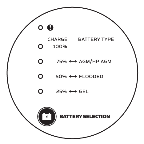 - To change the battery type, press and hold the Battery Selection button until the yellow LED corresponds to the desired battery type, then release the button.