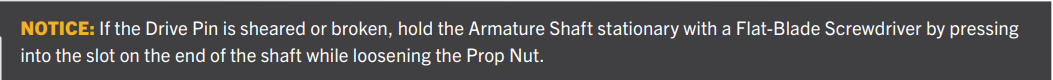 - Remove prop nut and washer. If the drive pin is sheared/broken, you will need to hold the shaft steady with a screwdriver blade pressed into the slot on the end of the shaft (Figure 1).