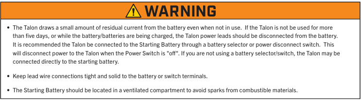 The Talon will operate with any lead acid or lithium, marine 12 volt battery. Maintain battery at full charge. Proper care will ensure having battery power when you need it, and will significantly improve the battery life.